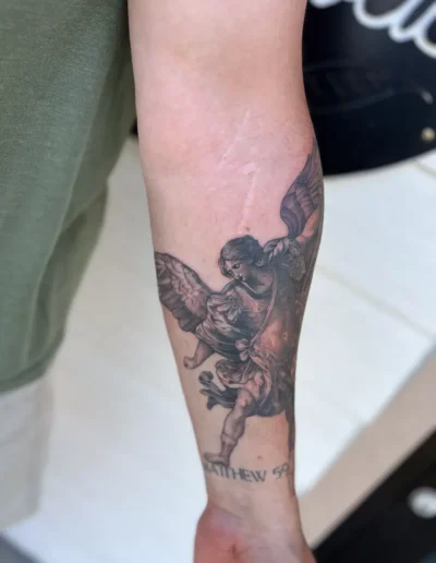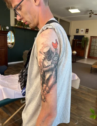 For Jeremy, tattooing is about growth, connection, and passion. He wants every tattoo he creates to be better than the last, and nothing matters more to him than seeing his clients overjoyed when they leave. He especially enjoys correcting and reworking old tattoos, transforming them into pieces that finally match the client’s vision—those moments of satisfaction are what drive him. The friendships he’s made along the way are just as rewarding as the tattoos themselves, and he believes the skin holds limitless potential for depth and storytelling.